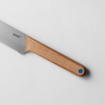 The handle is crafted from natural beech wood. It will patina over time and thereby make the knife uniquely yours. In the end of the handle, a plastic rivet, in our signature blue, is holding the knife together. It is made from the same material as traditional industrial chopping boards.