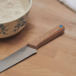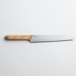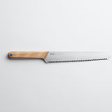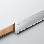 The BK22 bread knife compliments our fully forged collection, but with its own signature design. Made in Solingen, Germany, the blade is laser cut from high quality stainless steel and sandblasted with our signature, matte finish. It is equipped with 6mm teeth for a smooth cut. The blade is not flat, but has a very subtle curve which makes cutting bread effortless all the way through.