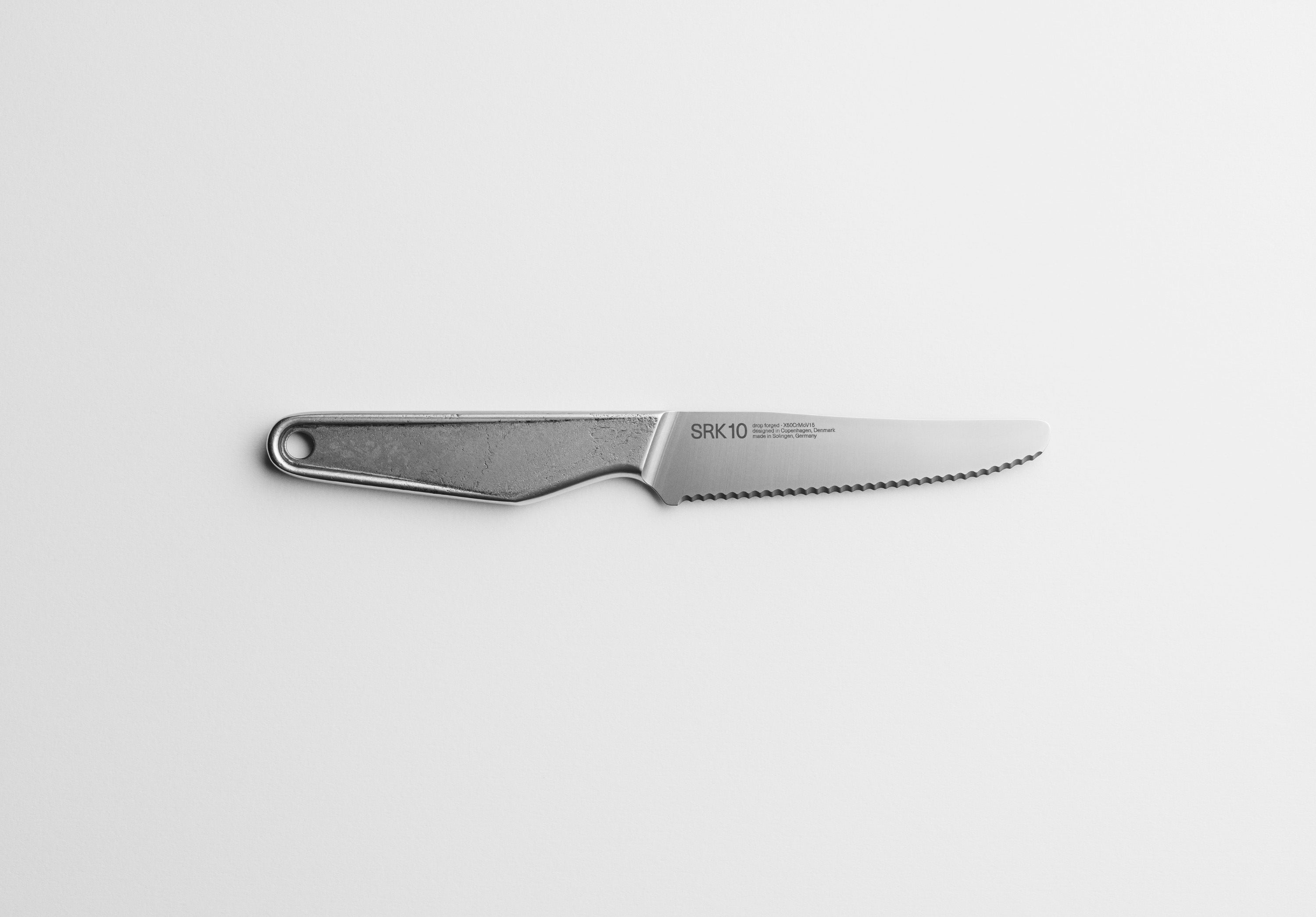 A serrated knife is the ultimate small all-rounder, and the ideal tool for cutting anything with a tough outside and soft inside, such as tomatoes, citrus fruit, bread, etc.